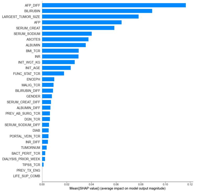 在数据预处理阶段,为了捕捉患者健康状态的动态特征,研究团队计算了传统评分中涉及的 6 个关键实验室变量的连续测量差值(DIFF),包括血清钠(serum sodium)、肌酐(creatinine)、白蛋白(albumin)、胆红素(bilirubin)、甲胎蛋白(AFP) 和 国际标准化比值(International Normalized Ratio, INR),以此捕获患者健康状态的动态变化轨迹,使总特征数增加到 31 个(25 个原始静态变量 + 6 个新增动态变量)。