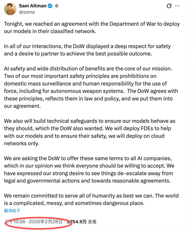 然而,当地时间上周五,奥特曼突然在X上公布了和DoW达成协议,将进行机密范畴合作的消息。说白了就是,替代Anthropic。