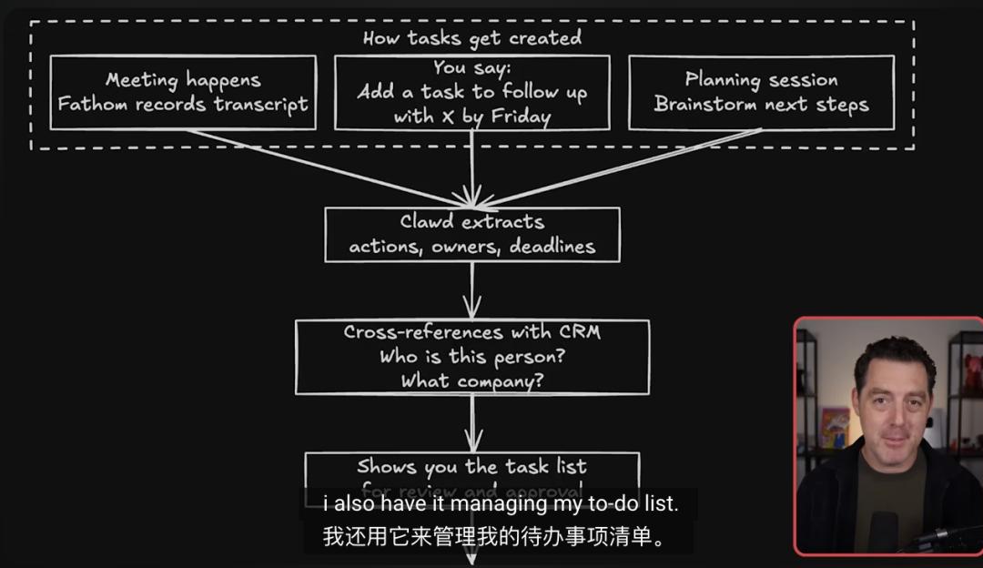 做视频时,他在Slack触发创意流水线,AI会全网调研、分析趋势,在Asana中生成包含标题建议、封面设计建议及脚本大纲的任务卡。