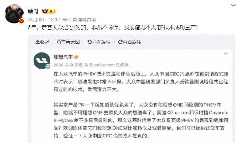 这两天汽车圈最爽的瓜,莫过于理想高管“硬哥”给大众集团来了一个结结实实的“六年回旋镖”。