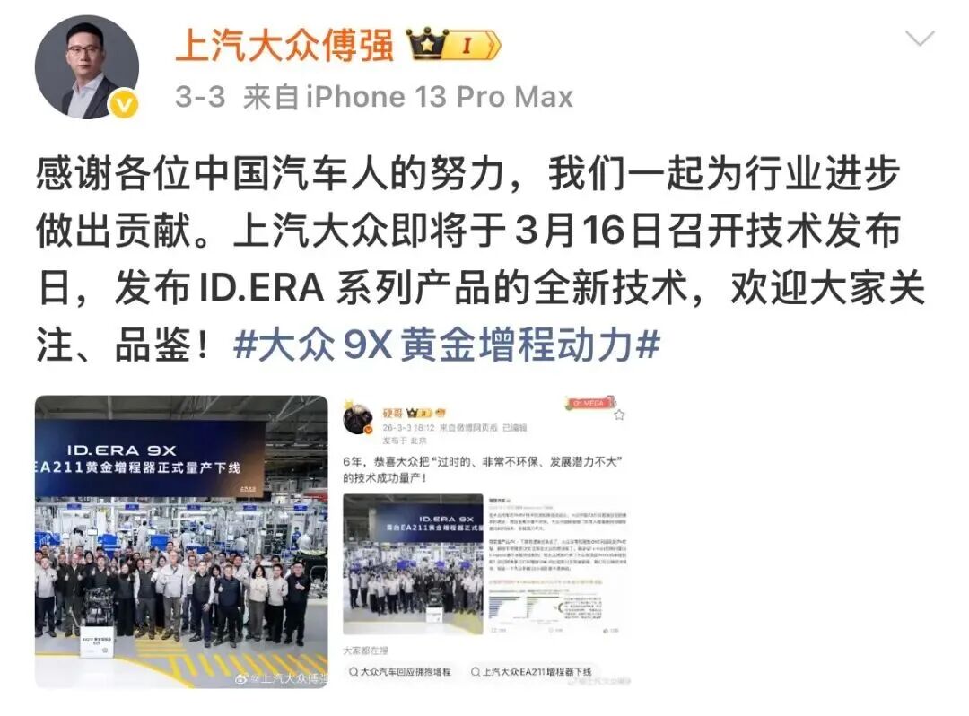事情的起因很简单:上汽大众宣布其首台EA211增程器下线,将搭载于新车ID. ERA 9X上。