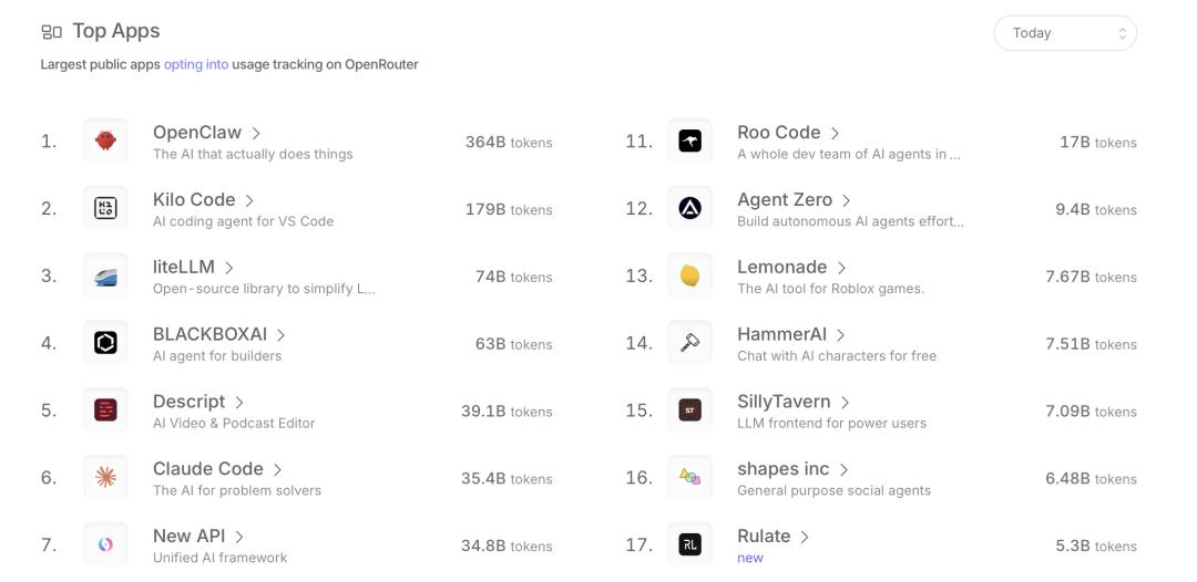 OpenRouter的后台数据也佐证了这种疯狂,最新数据显示,OpenClaw已是OpenRouter最大的单一应用,其Token消耗量约占平台显著比例。Token消耗从"按次"变成了"按流量",AI使用的成本曲线正在急剧变陡。