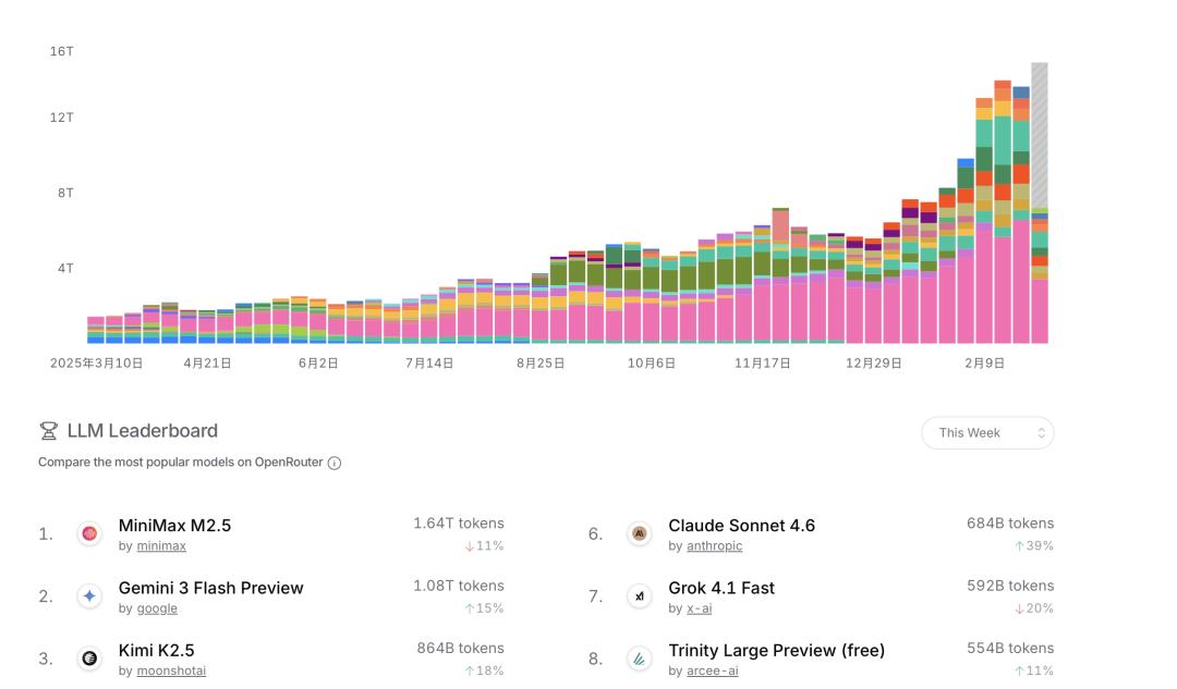 Kimi K2.5 在这轮浪潮中的商业回报已经显现。OpenRouter 数据显示,Kimi K2.5 是 OpenClaw 调用量最高的模型。受全球付费用户及API调用量大涨的推动,Kimi K2.5 发布不到一个月,近20天的累计收入已超过2025年全年总收入。