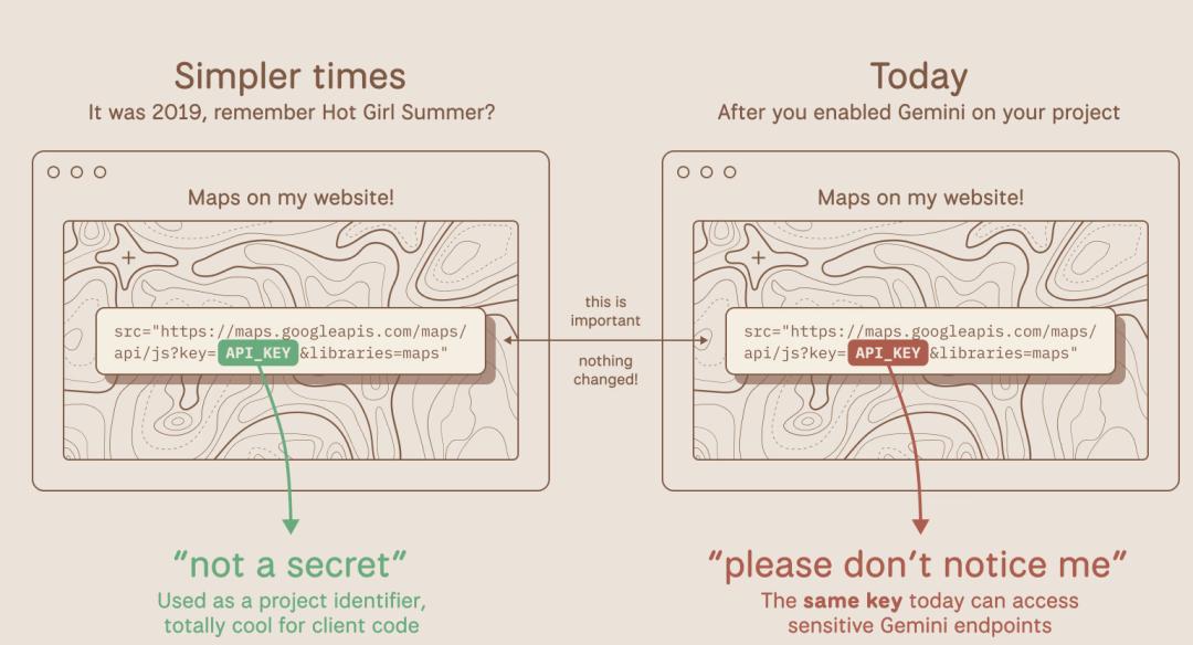 权限溯源扩张(Retroactive Privilege Expansion)。你三年前创建了一个 Maps Key,并严格按照 Google 的指引嵌入到网站源代码中。上个月,你团队的某个开发者为内部原型启用了 Gemini API。现在,你的公共 Maps Key变成了 Gemini 的认证凭证。任何抓取到它的人都可以访问你的上传文件、缓存内容,并让你的 AI 账单飙升。没有人通知你这一变化。