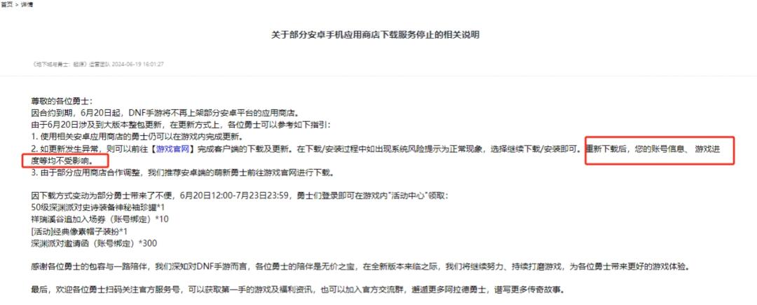 2024年6月,刚上线不久的《地下城与勇士:起源》就发布公告称,与部分安卓渠道不再合作。