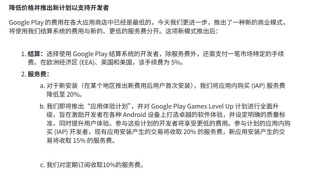 而最被关注的降低开发者费用,也就是渠道分成方面,新的商业模式下,Google Play的费用分为两部分,一是使用谷歌支付需要承担的服务费,这部分在欧美地区为5%;第二部分为服务费,新安装用户,IAP费用降至20%,达标优质应用可降低至15%,而订阅类的服务费则为10%。
