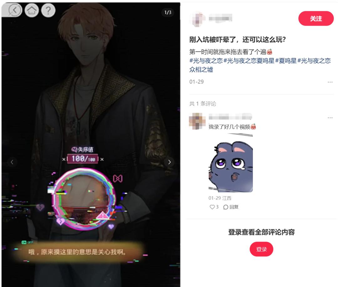 就比如在女性向赛道,1月28日,腾讯《光与夜之恋》推出了众相之墟夏鸣星微恐主题活动剧情。一位专注于女性向游戏的朋友告诉我:“虽然它不会让人感到真正意义上‘生理性恐怖’,但很好地通过微恐解谜题材发挥了吊桥效应,在一同面对难题的过程中营造出约会的甜蜜感。”