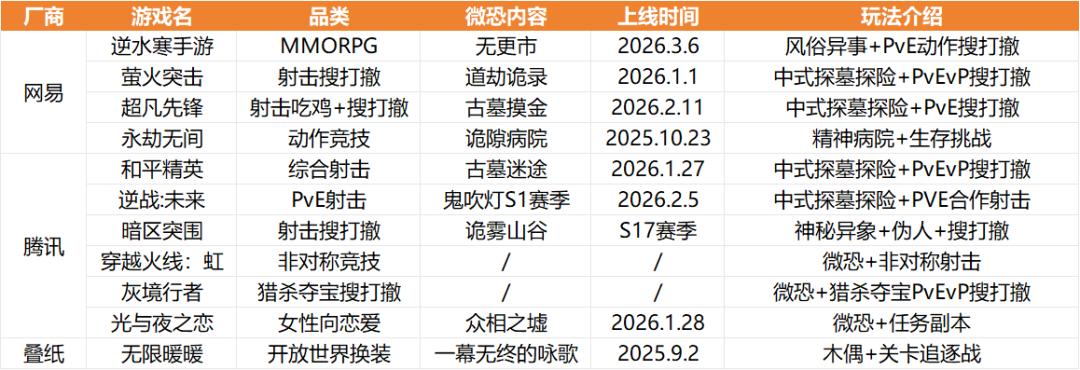 总体而言,仅从头部厂商的动作来看,微恐赛道已然从去年的单款产品爆发进入到多局部尝试。尤其是在腾网外卷+内卷的射击和搜打撤领域,微恐+X有可能为各家产品带来一些增量。