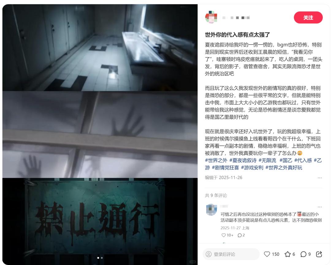 与之类似,网易无限流言情女性向恋爱游戏《世界之外》,也推出过【夏夜诡叙诗】系列微恐剧情向内容。综合而言,这类微恐+女性向恋爱的游戏模式,并非注重玩法的类型,而侧重叙事表达。这或也是女性向游戏特有的融合微恐元素的方式。
