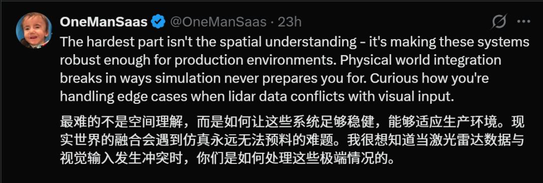 另外在评论区,一位机器人工程师说了一句非常真实的话:最难的不是空间理解,而是让系统在现实世界稳定运行。