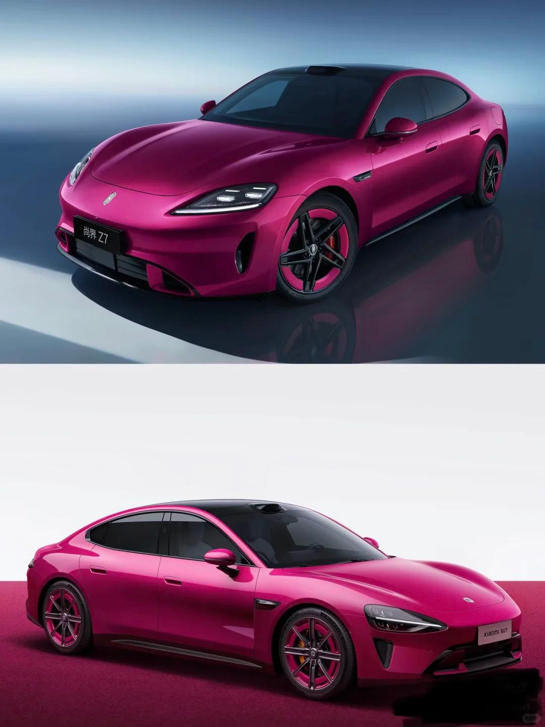 而相比安全和激光雷达上的极致追求,华为鸿蒙智行更出圈的是提前亮相了新车——动轿车尚界 Z7 和猎装车 Z7T,从外观上看,电光紫粉的颜色显出动感时尚,而个性轿跑的外观也让其与小米 SU7 和保时捷 Taycan 有很高的相似度,更重要的是,它们目标用户都是年轻人。