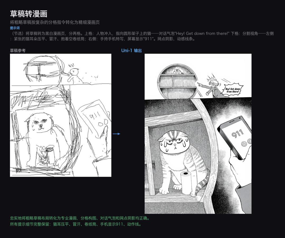 Uni-1完美地将草稿意图转化为专业漫画:分格构图、对话气泡的位置和方向都精准还原,所有细节完整保留——猫耳朵、翘起的尾巴、卷烟缸、书架上的书,甚至手机屏幕显示着911。