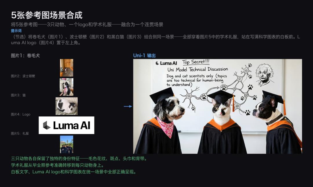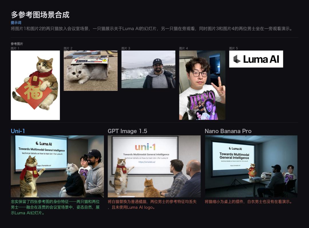 Uni-1精确还原了每张参考图的身份特征——猫的毛色花纹、男士的五官和发型、logo的细节——并将它们合理地组织进了同一个场景。