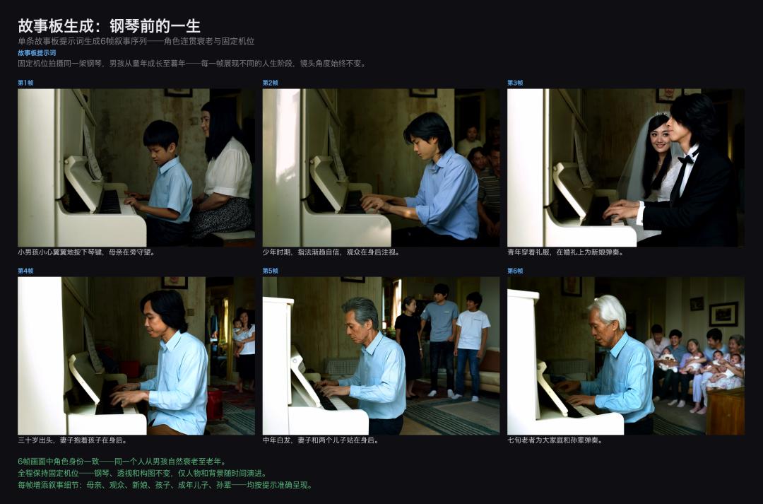 6帧画面中角色身份保持一致——同一张脸,钢琴、透视和画风不变,仅人物形象和背景随时间变化。这种跨帧的角色一致性和时间叙事能力,是当前图像模型的核心难题之一。