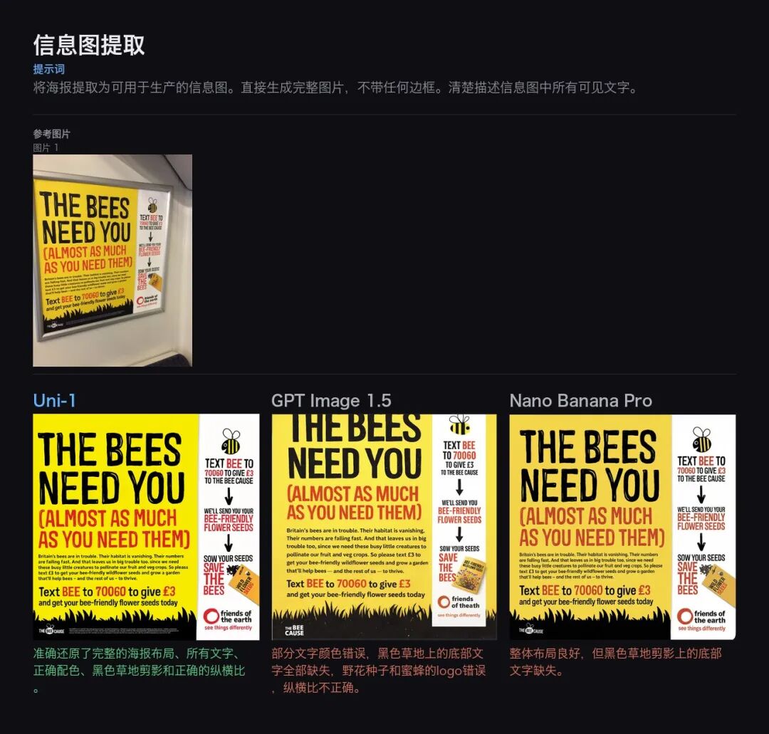 Uni-1准确还原了完整的海报布局、所有文字、正确配色,以及黑色草地剪影和正确的纵横比。GPT Image 1.5部分文字颜色错误,底部文字全部缺失,野花种子和蜜蜂的logo也出了问题。Nano Banana Pro整体布局尚可,但底部文字同样缺失。