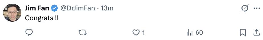 英伟达机器人主管Jim Fan也送上了祝福: