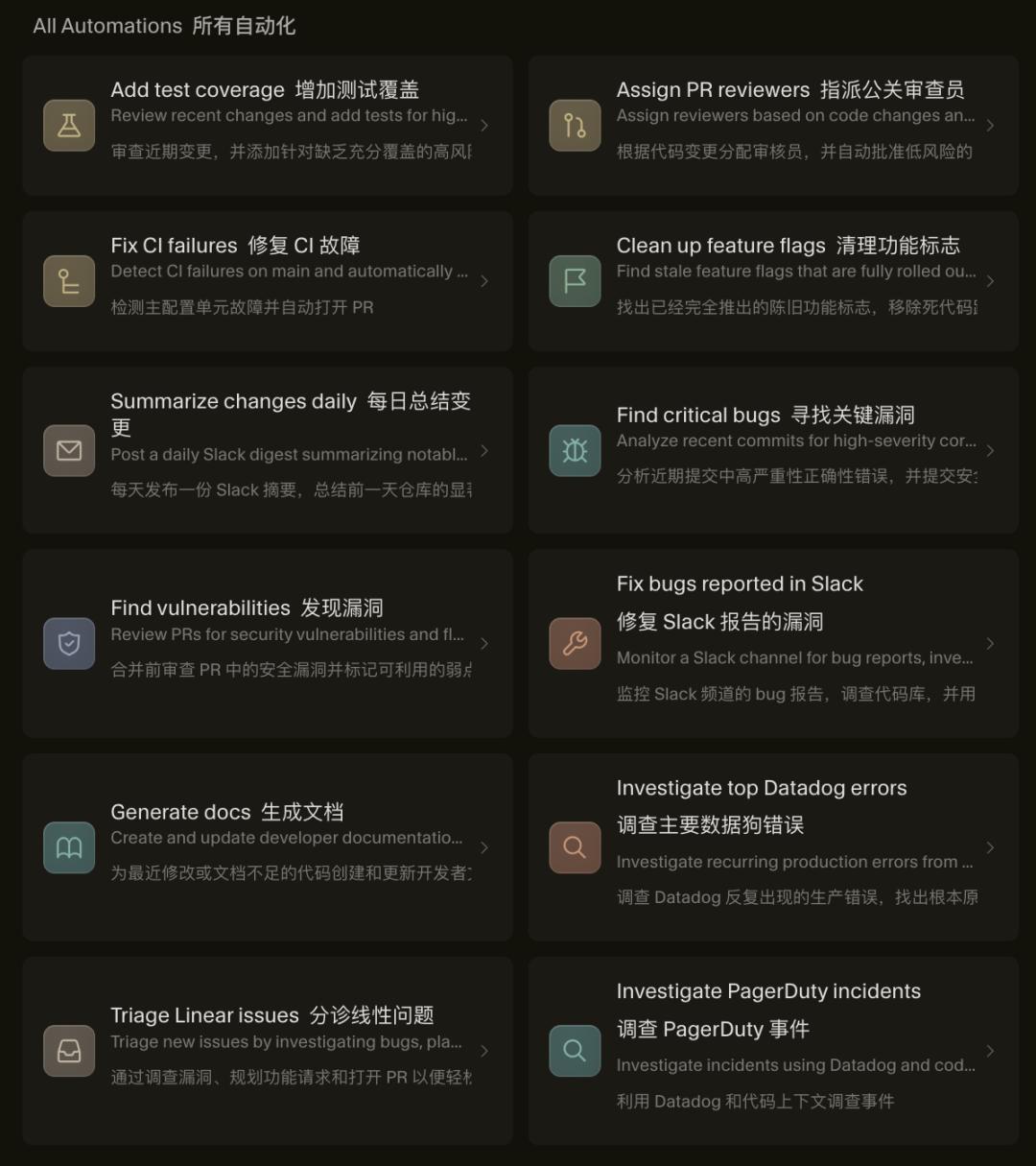 目前Cursor已经在官网放出一批自动化Agent,包括修复CI故障、每日总结变更、发现漏洞、生成文档等12个。