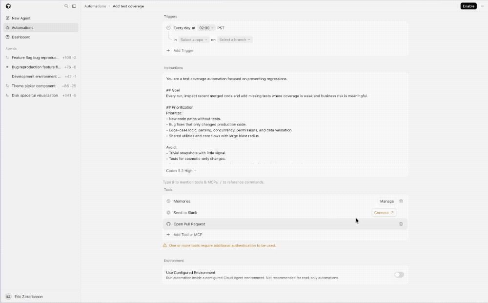 测试覆盖范围(Test coverage)的自动化Agent会在每天早晨,审查近期合并的代码,识别需要补充测试覆盖的部分。它会遵循项目现有规范编写测试,仅在必要时修改生产代码。Agent在运行相关测试后,再创建并提交PR。
