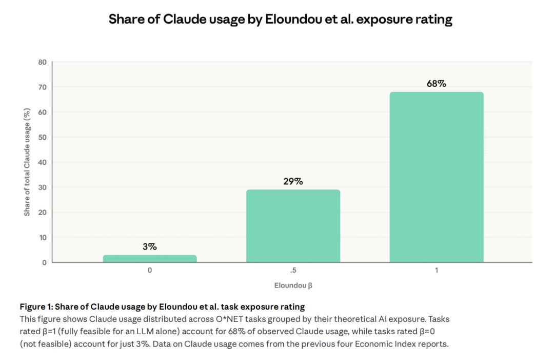 数据来自三个地方,包括O*NET职业数据库(美国约800个职业的具体任务),Claude的真实使用数据以及大模型的理论能力研究。