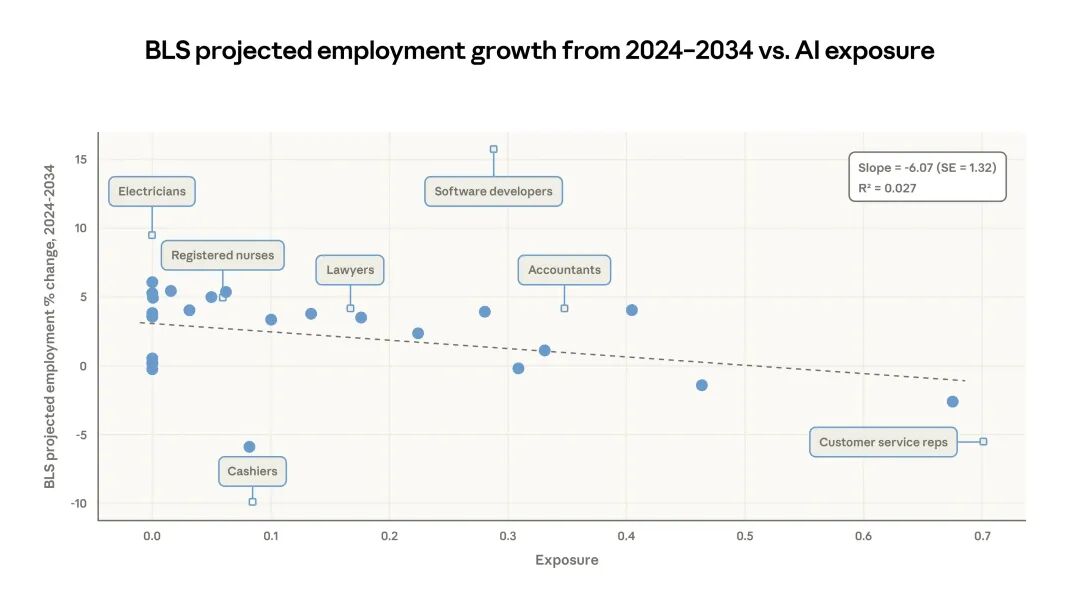 - 暴露度越高的职业,未来十年就业增长越慢;