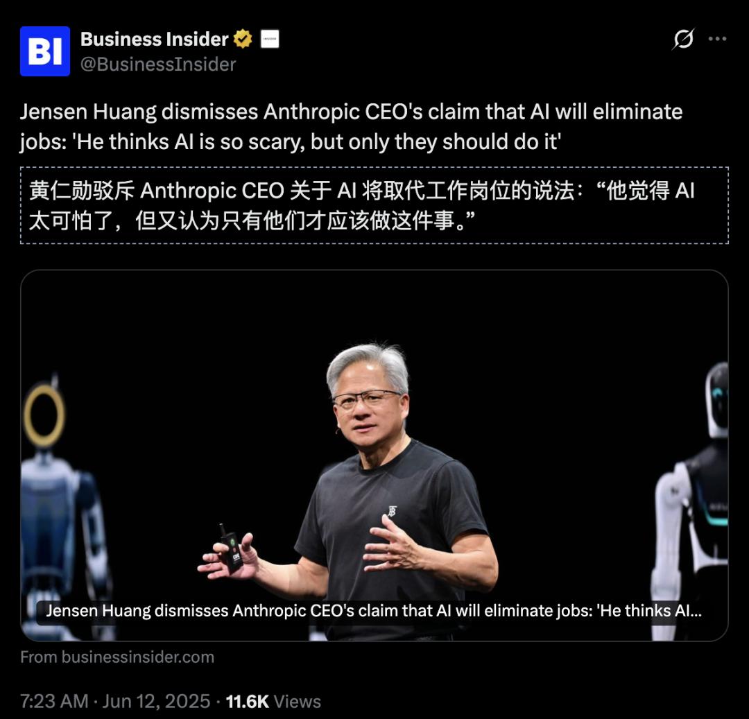 Amodei的警示甚至引来英伟达CEO黄仁勋的驳斥: