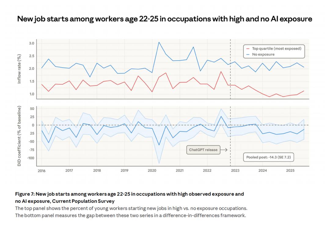 可另一个信号更危险:22-25岁的年轻人,在高暴露岗位的入职率直接掉了14%。老员工还能靠经验苟住,新人连门都摸不到了。