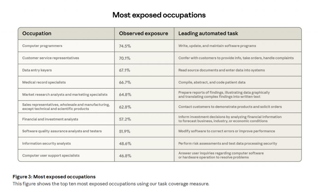 程序员的日常工作中,已有约75%的任务可以被Claude覆盖!紧随其后的,是客服代表(70%)、数据录入员(67%) 等岗位。
