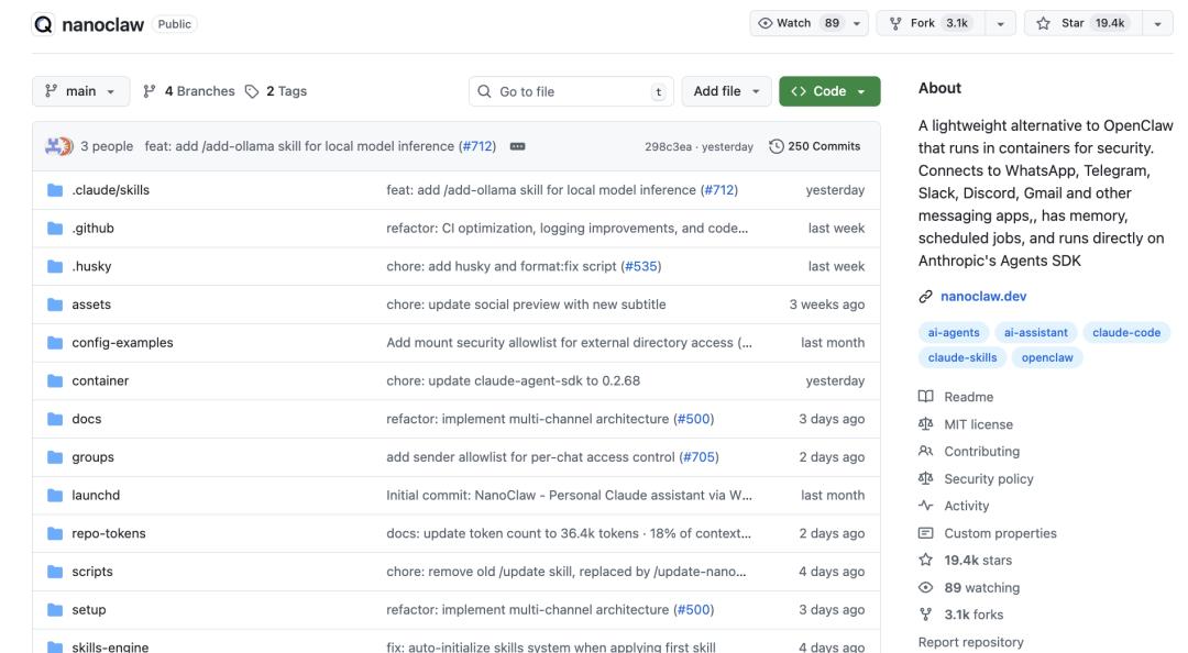 这种“少即是多”的设计思路,让 NanoClaw 在发布之初就吸引了大量关注。 2 月 2 日上线后,很快在 GitHub 上收获 19,400 颗 star。