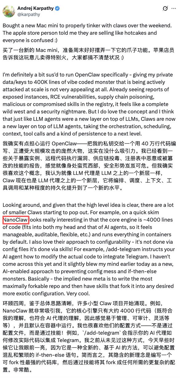 自从 OpenClaw 爆火之后,各种“Claw”项目接连出现,其中以安全优化版 NanoClaw 最为知名。它的核心代码仅有 4000 行,却获得了 AI 大牛 Andrej Karpathy 的点赞。