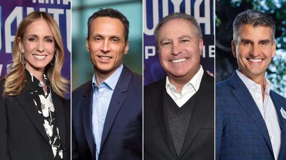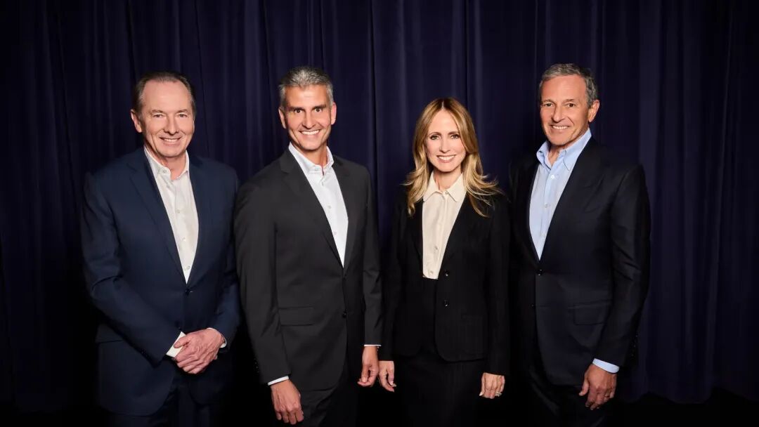 从左至右:迪士尼电视和流媒体业务负责人达娜・沃尔登、体育媒体业务负责人吉米・皮塔罗、电影业务负责人艾伦・伯格曼,以及新任CEO约什·达马罗