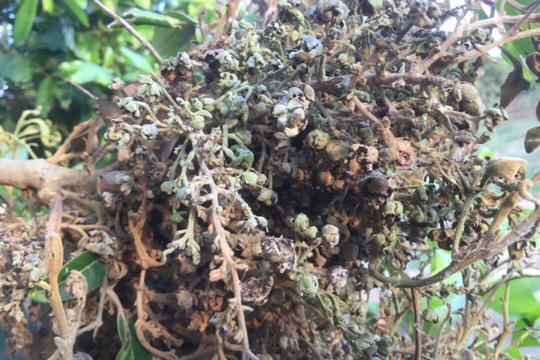 数千只瘿螨会寄生在龙眼树上,啃食树叶为生。但瘿螨的唾液会感染荔枝树新鲜的嫩芽,在不断的啃食和感染之后,原本延伸的枝条和平整的树叶会蜷曲皱缩,形成畸形的女巫扫帚,结不出荔枝。