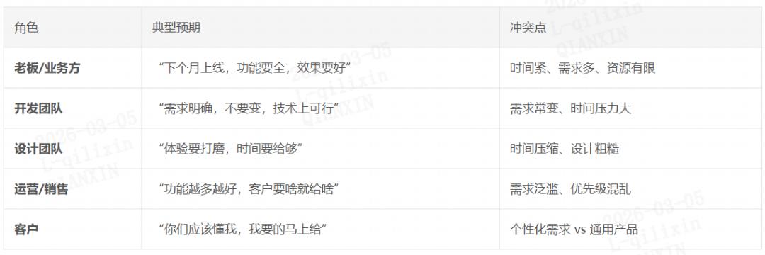 你手上没有直接的行政权力,却要驱动开发、设计、运营、销售等多个团队朝着一个目标前进。而在这个过程中,各方对你的产品都有不同的期待: