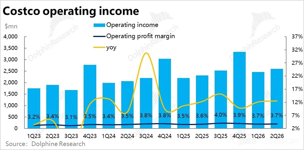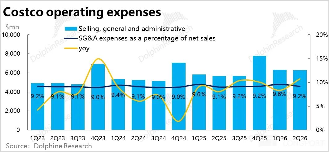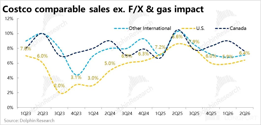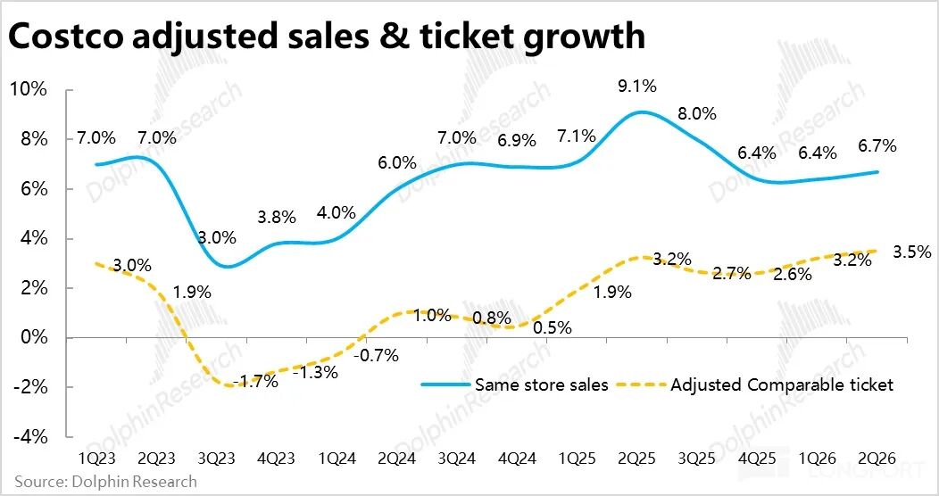 核心经营指标上,Costco 本季度整体同店销售增速为 7.4%,比上季的 6.4% 明显提速,也好于市场预期。不过分价量驱动因素来看,同店客流量增速实际环比持平在 3.1%,并未提速。主要是靠客单价走高拉动的增长,本季增长 4.2% vs. 上季的 3.2%。