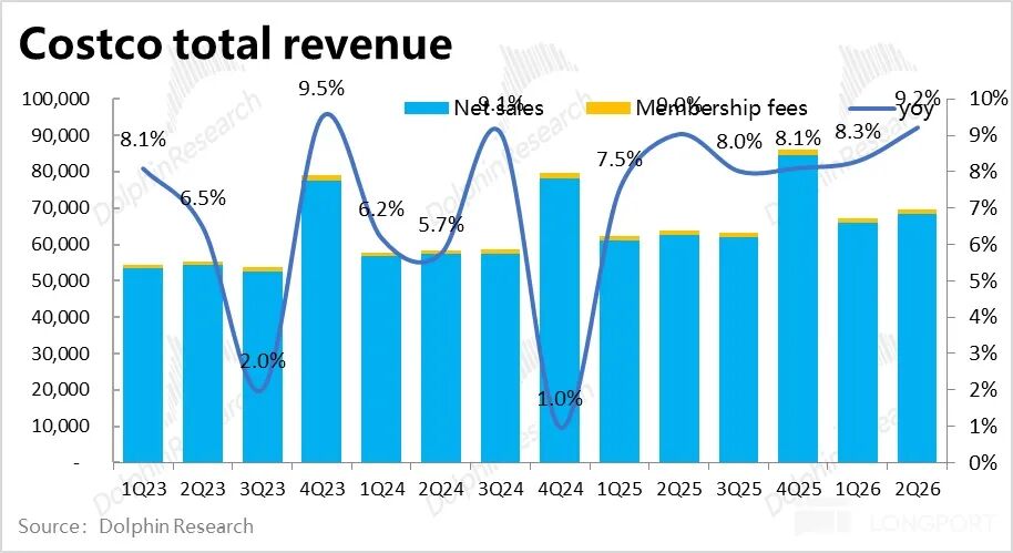 1、汇总以上零售收入和会费收入,本季 Costco 实现总收入$696 亿,同比增长 9.2%,环比有所提速且好于市场预期。