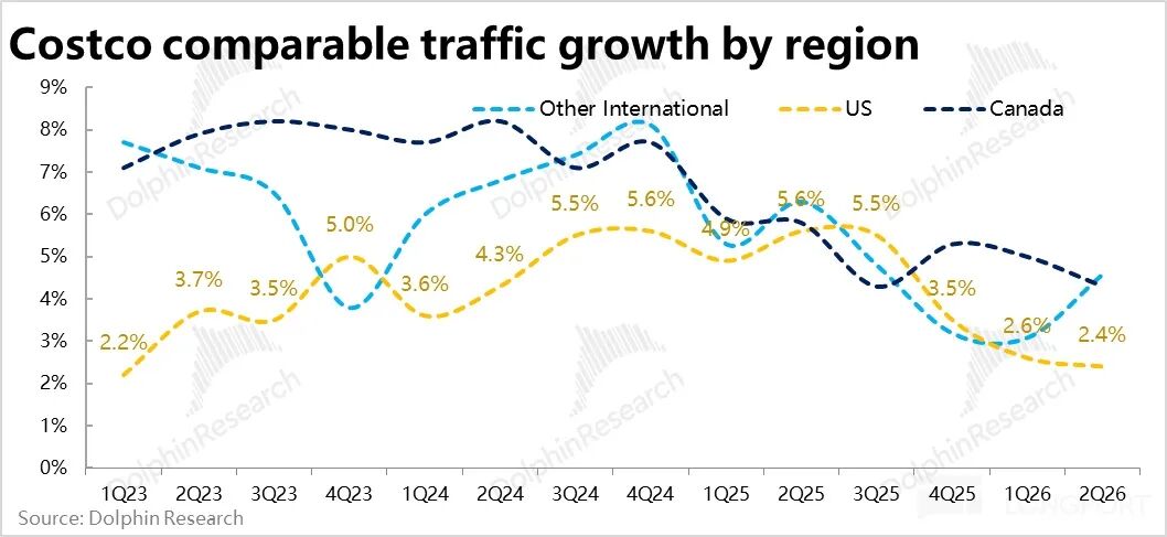 加拿大地区情况类似,同样客流量增速有所下滑。而公司开拓的新市场—其他国际地区的增长则更高质量,更多由客流增长而非客单价驱动。同店销售增长中,2.4% 由客单价驱动,4.6% 由客流量驱动,且客流量在加速增长。