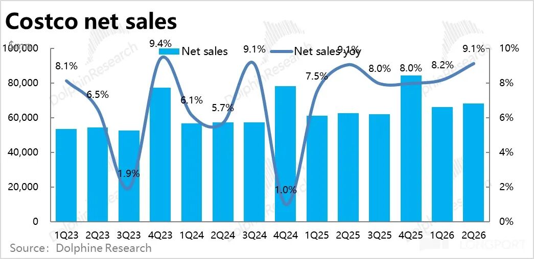 最终整体上,本季 Costco 商品销售收入同比增长了 9.2%,较上季有明显提速,且好于市场预期的 8.5%