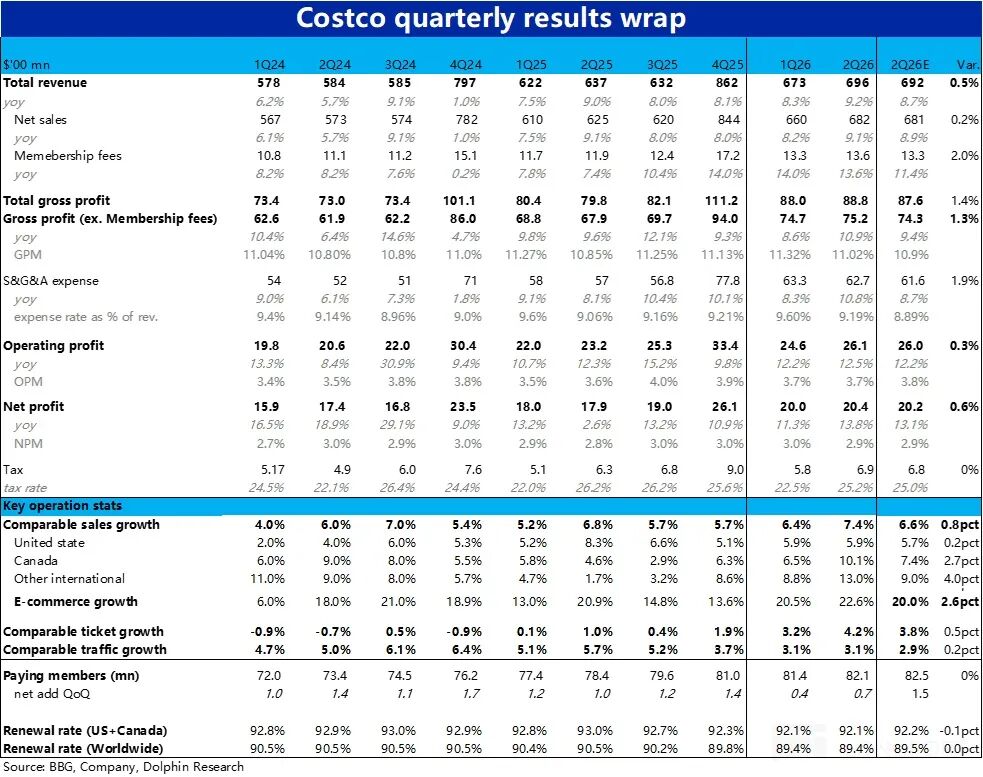 全球折扣零售王者—开市客(COST.US) 今早美股盘后,发布了截至 2 月 15 日的 2026 财年 2 季度财报。整体来看,业绩依然稳健,营收和利润都稍好于预期。具体来看: