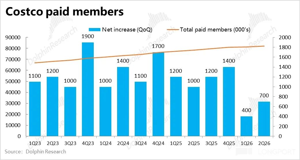 根据公司先前的解释,续费率持续下滑、以及付费会员增长还是偏弱,主要是疫情后,Costco 通过线上渠道或者折扣渠道,拓展了大量非 Costco 核心目标客群的新用户,因此拖累了续费率。