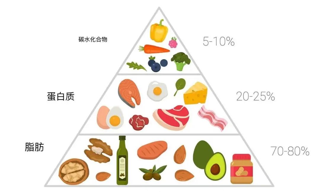 看到这里,我忽然想起前几年风很大的“生酮饮食”。这种饮食模式倡导每日摄入大量脂肪(70%~80%)、适量蛋白质(10%~20%)和极少量碳水(5%~10%),把身体的主要能量来源从消耗葡萄糖硬生生掰成消耗脂肪分解而成的酮体。