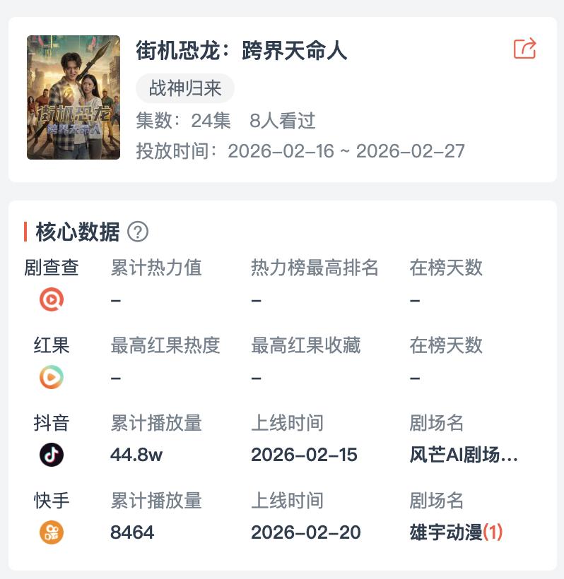 近日,DataEye研究院发现,草花互动在2月中旬上线了一部名为《街机恐龙:跨界天命人》的AIGC短剧。无独有偶,最近最火的AI漫剧之一《气运三角洲,我凭操作吊打全球》,蹭了热门游戏题材,跻身榜单第二;此外广州轻舟互娱游戏公司也在入局漫剧,并积极招聘人才。