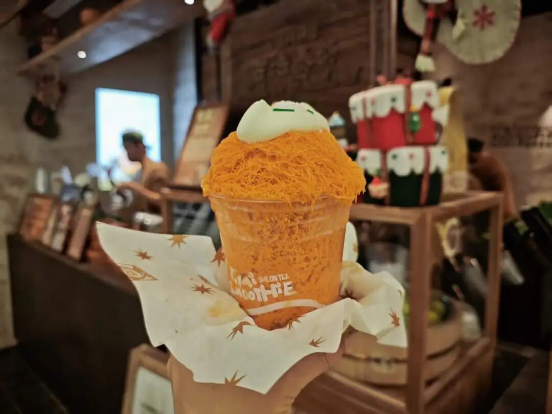 在其新开的汕头万象城店,除饮品外,还能看到泰茶雪糕、斑斓糕、斑斓牛油烤面包、椰子冻等产品,同时还有特产零售,如香蕉脆片、榴莲干等。