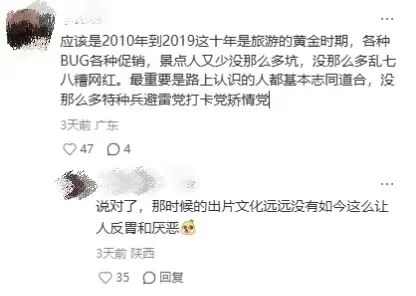 另一个广东网友接上称,2010年到2019年这整整十年,各种BUG机票、促销,景点人少,坑也少,路上认识的人基本志同道合,也没有那么多特种兵、避雷党、打卡党、矫情党。