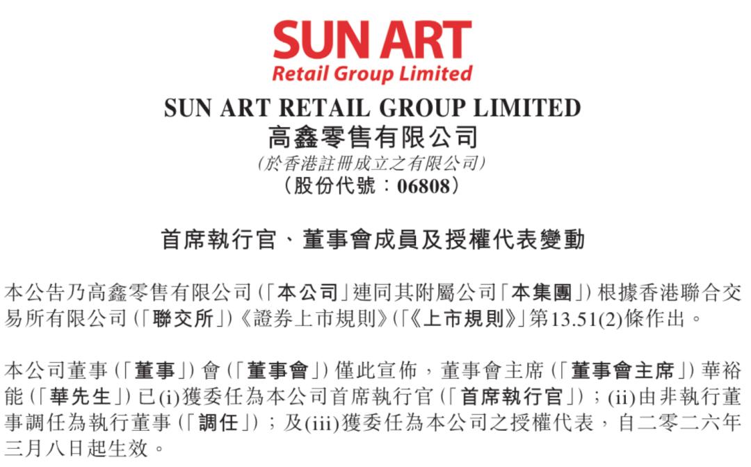 3月8日,高鑫零售在港交所发布公告称,董事会主席华裕能已获委任为公司首席执行官,而前任首席执行官李卫平因长时间未能履行职责被免除职务。公告中一句“仍未能取得联络”,将公司的治理危机直接推向了舆论高峰。