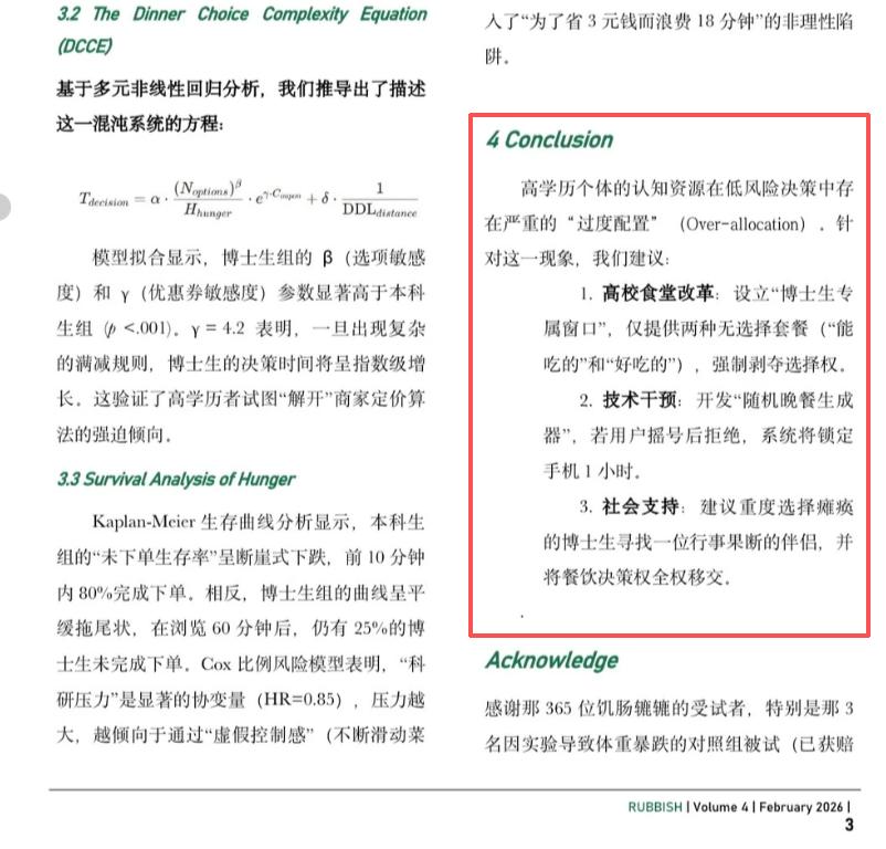 比如这篇《 高学历个体在低风险决策场景中的选择瘫痪 : 以 “ 晚餐吃什么 ” 为例的纵向行为研究 》,作者通过层层递进的科学论证,最终得出结论:为了避免大伙儿在吃上选择困难浪费生命,方法之一,是让食堂只向学生提供两种套餐,强行剥夺选择权。
