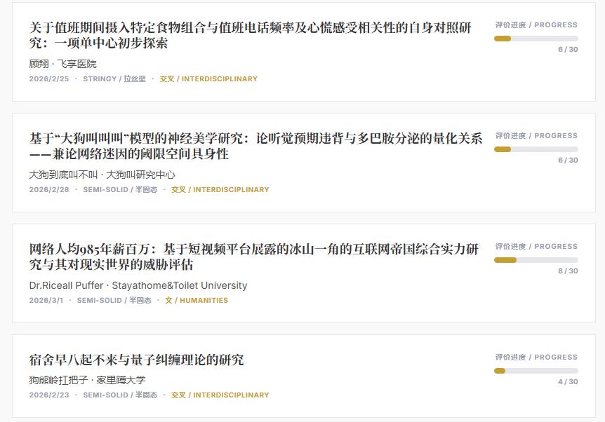 所谓学术底刊,就是网友自发创立,用正经科研的形式,认真研究不正经问题的三无假期刊。这里发表的文章没啥高大上的立意,主要讲究一个弱智 + 学术的微妙反差。