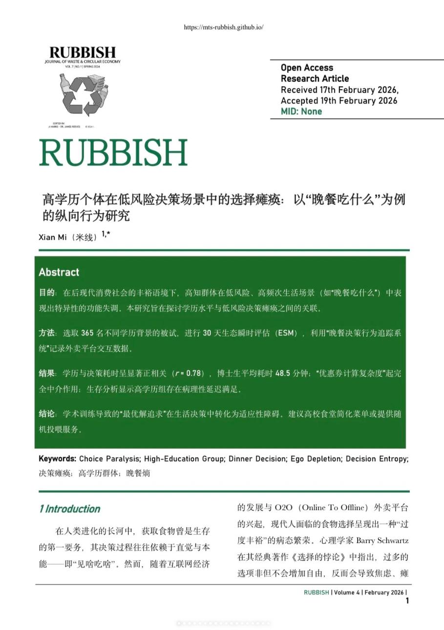 米线. 高学历个体在低风险决策场景中的选择瘫痪:以“晚餐吃什么”为例的纵向行为研究[J]. Rubbish, 2026, 1(4): 1.