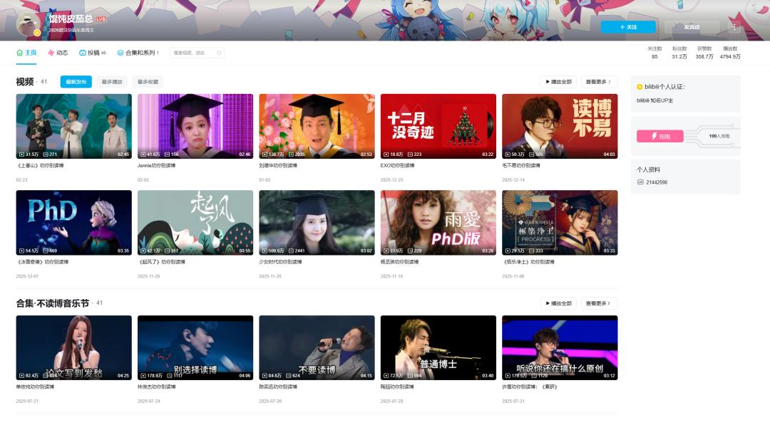 去年,B 站的一个 UP@馄饨皮茄总用 7 个月时间,硬生生涨了 30 多万粉,不少研究生纷纷前来打卡,目前茄总百万播放的视频已经有十五条。