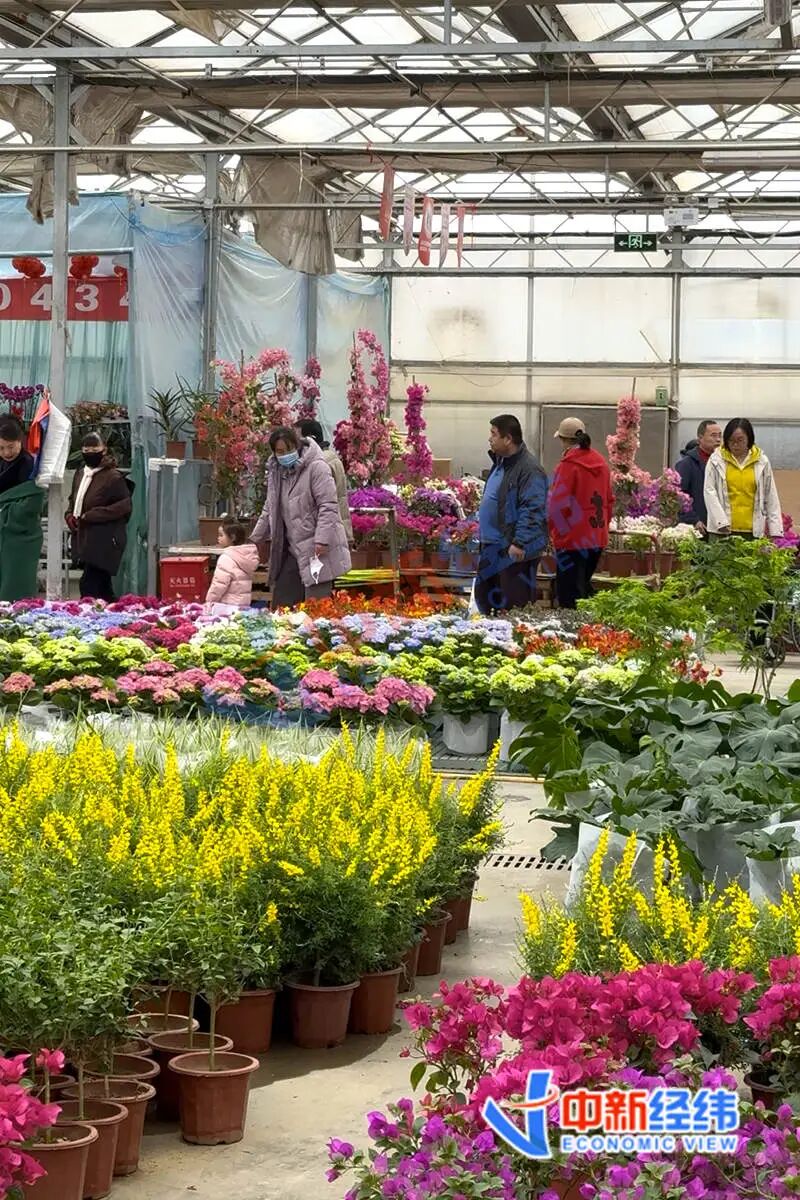 位于顺义的北京国际鲜花港绿植花卉分拨中心的花卉展销大厅里,各色花卉摆满货架,市民推着小车正在挑选。