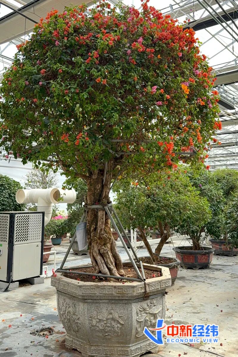 在花市上,一些造景型盆栽价格更高。在北郎中花木中心的三角梅培育基地温室门口,两棵约3米高的盆栽三角梅格外醒目。负责养护花卉的曹先生介绍说,每棵售价都在10万元以上。