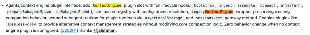 翻译成人话:开发者现在可以在不修改OpenClaw核心代码的情况下,完全自定义上下文的处理逻辑。你想用RAG?可以。想做激进压缩?随意。想让不同子任务拥有隔离的记忆空间?接口都给你准备好了。